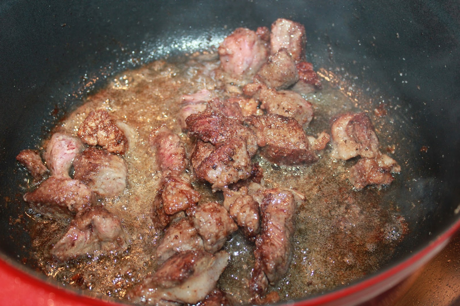 | Add floured beef in small batches to the hot bacon fat, adding more oil as needed until all the meat has been browned. |