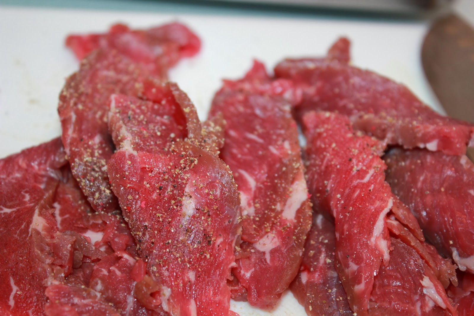1-1/2 lb. beef steak good cut, sliced 1/4 inch thick, slices cut crosswise into 1-inch pieces